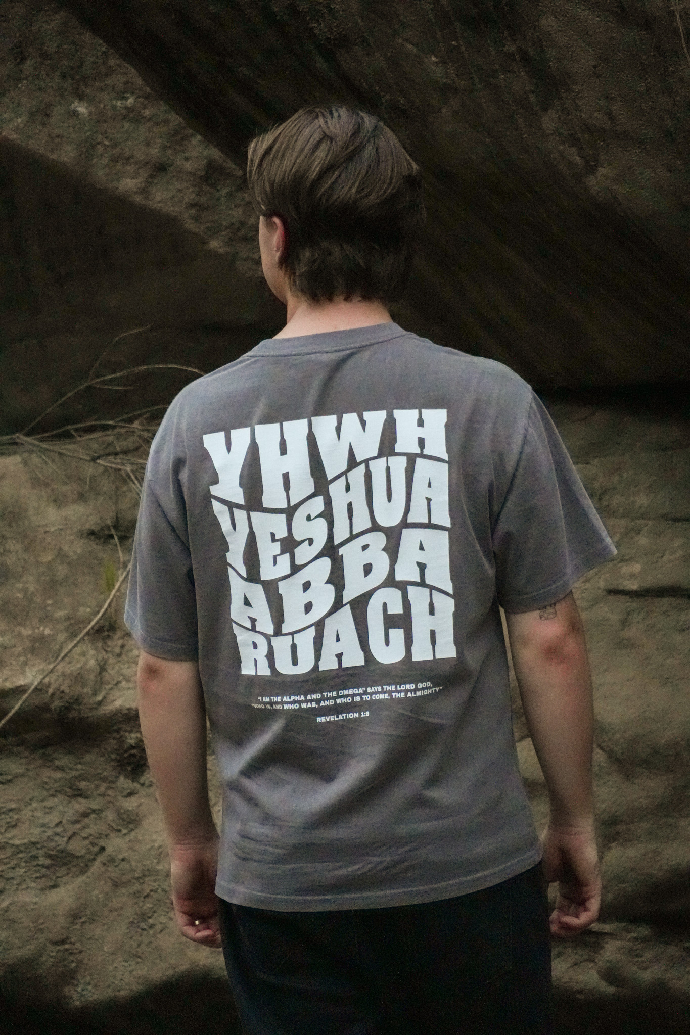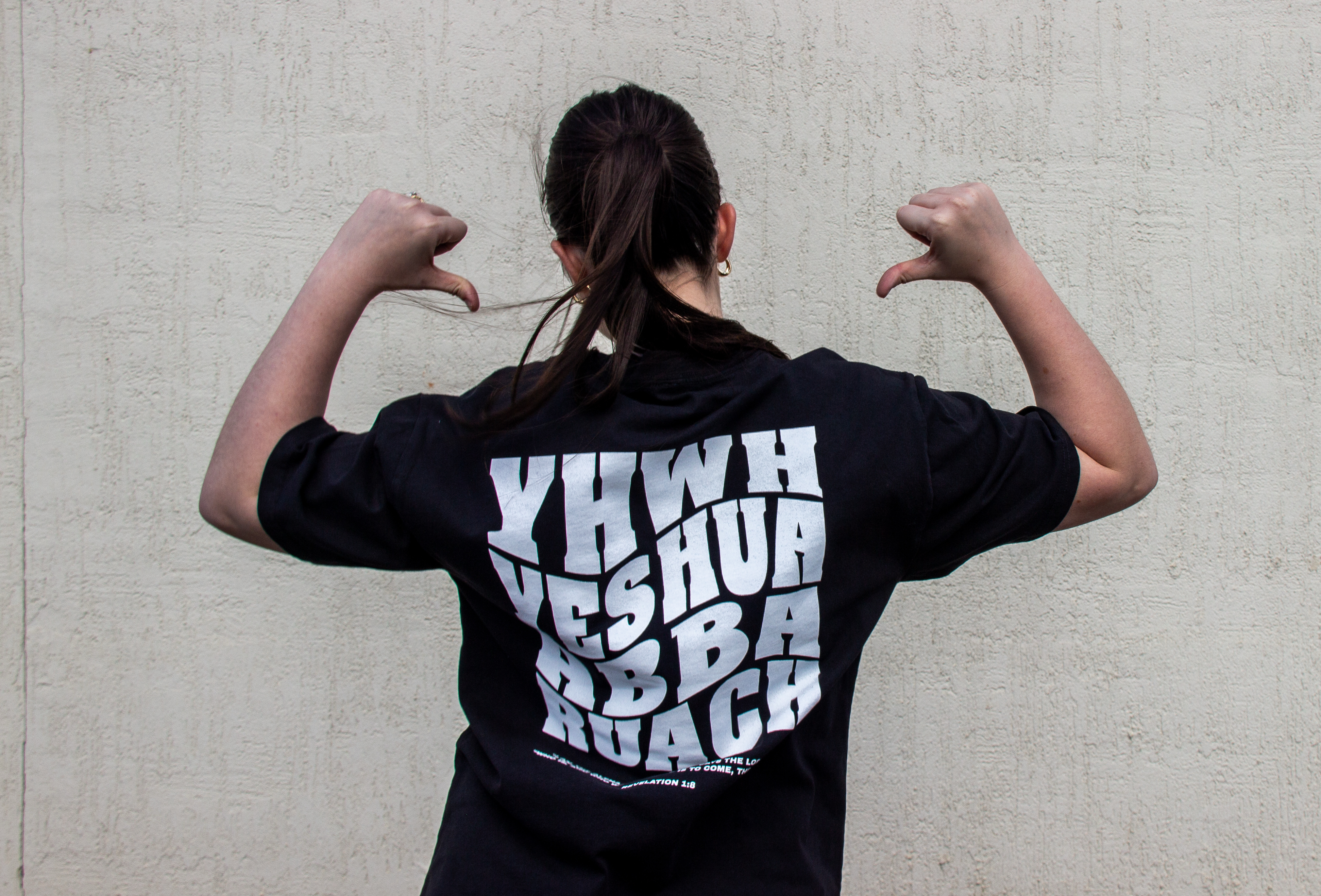 This tee features YHWH embroidered on the front in both Hebrew and English.